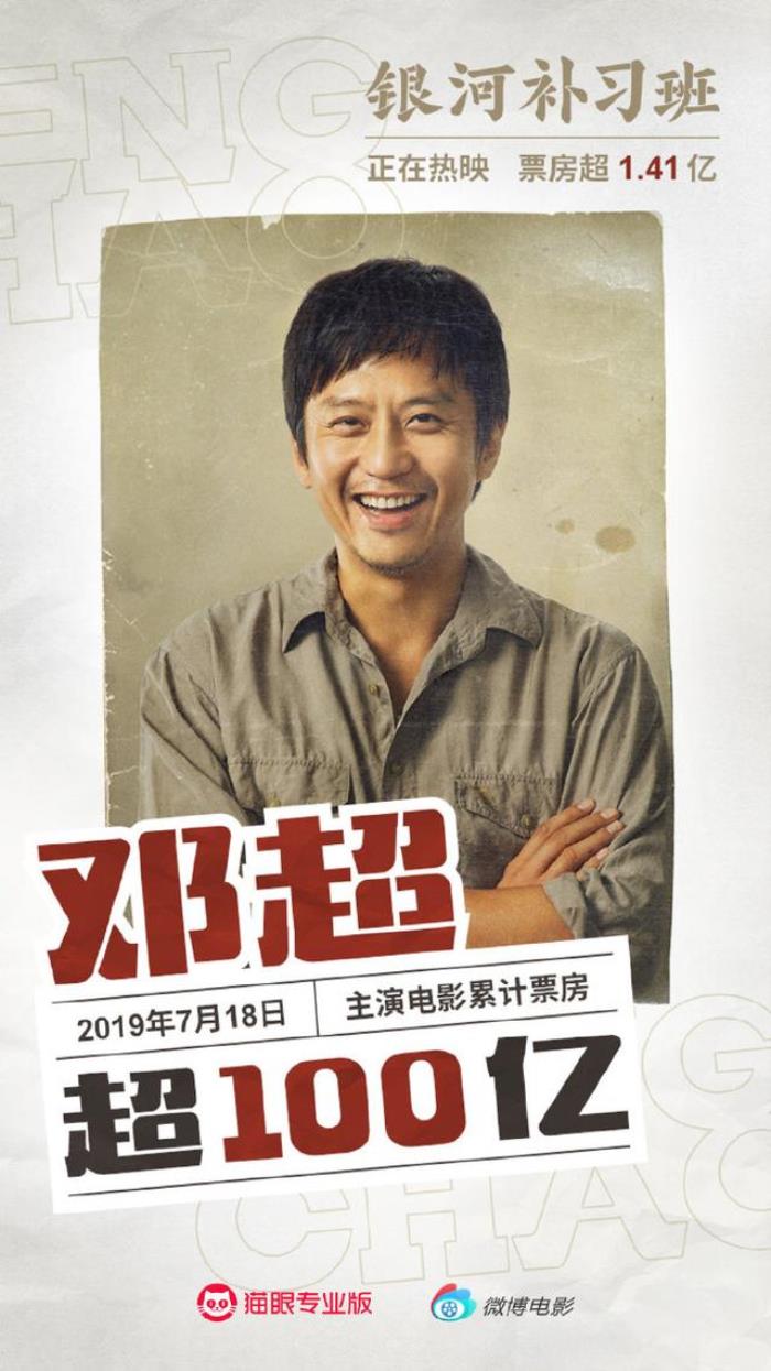 据猫眼数据,随着《银河补习班》票房迈过1.41亿,邓超主演电影累计票房也超过100亿,成为中国电影市场第9位百亿影人,也是继吴京、沈腾、黄渤之后第4位华语百亿影人。