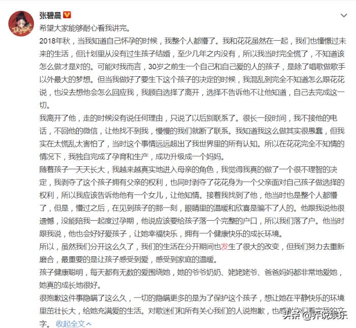 按照张碧晨的解释来看,一面她和华晨宇正在热恋,两人有着不生孩子的约定,不料事与愿违她意外怀孕了;一面将怀孕事实瞒着华晨宇,忍痛分手,独自承受,悄悄生下孩子。