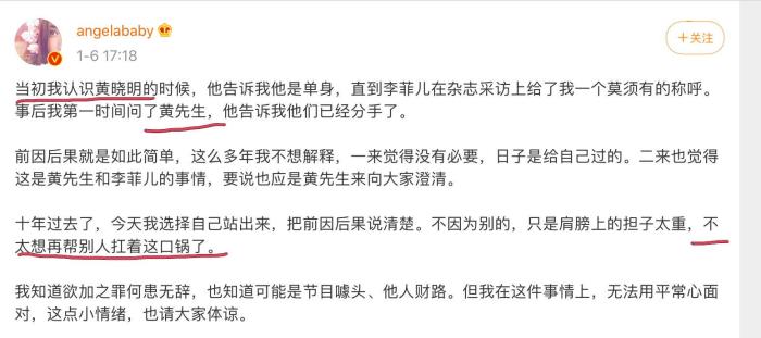 但其实两人的婚姻破裂似乎早就有预兆,起初就是在2020年《乘风破浪的姐姐中》,在1月6日节目录制时,在节目现场李菲儿叫“晓明哥”的新闻一出,或许是因为屡上热搜,杨颖一改之前不关注的态度,直接在社交平台上表示,自己不是他俩分手的第三者,通篇显示自己的无辜。之后黄晓明也发出声明,表示是自己的错,与杨颖无关。