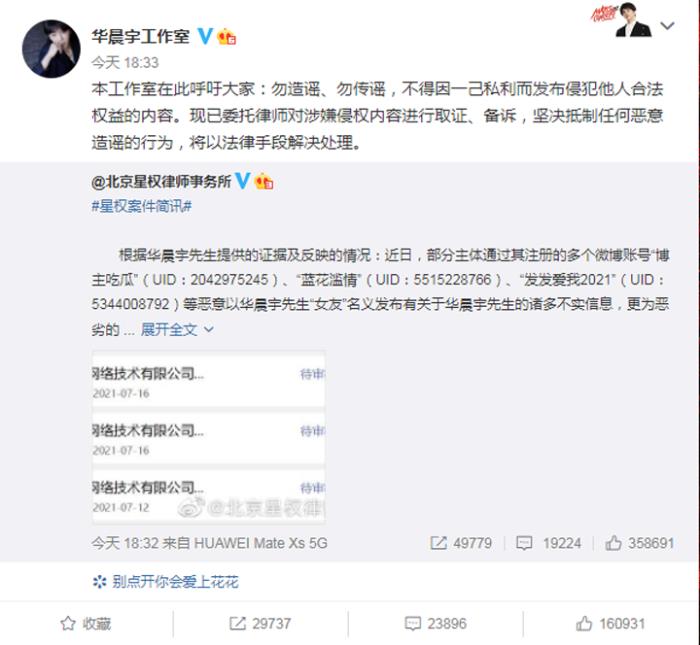 因为爆料的内容,涉及到张碧晨、华晨宇的个人名誉,因此华晨宇工作室和张碧晨工作室先后发布律师声明。