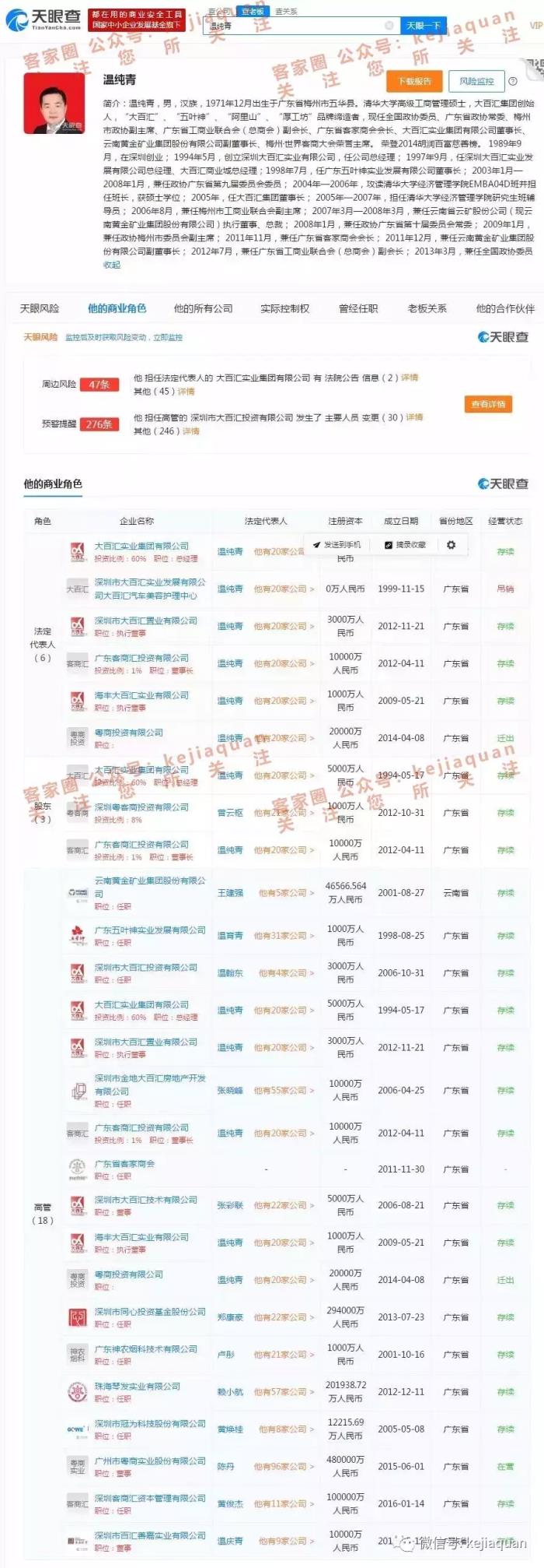 根据天眼查上的介绍,温纯青不只是广东客家商会的会长,并且还是广东省工商业联合会(总商会)副会长,曾经出任过广东政协常委和全国政协委员。2018新财富500富人榜榜单上,温纯青以85亿身家位列第355名。