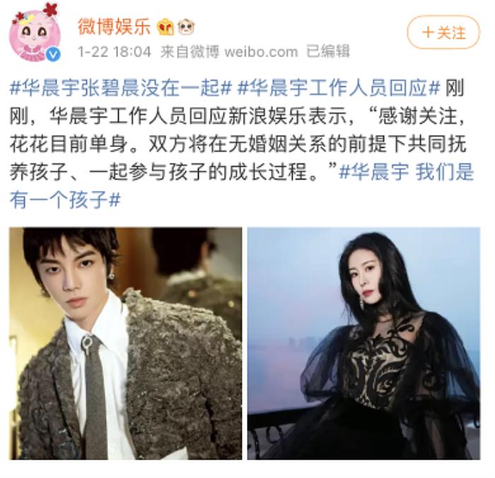但随后工作室发声:华晨宇和张碧晨并没有结婚,两人均是单身,会在不恋爱、无婚姻关系的前提下共同抚养孩子。