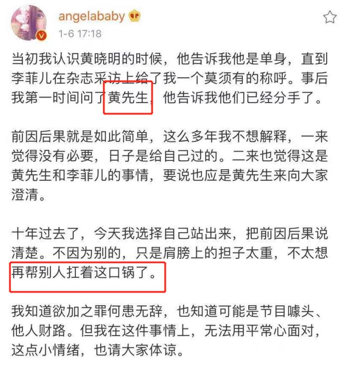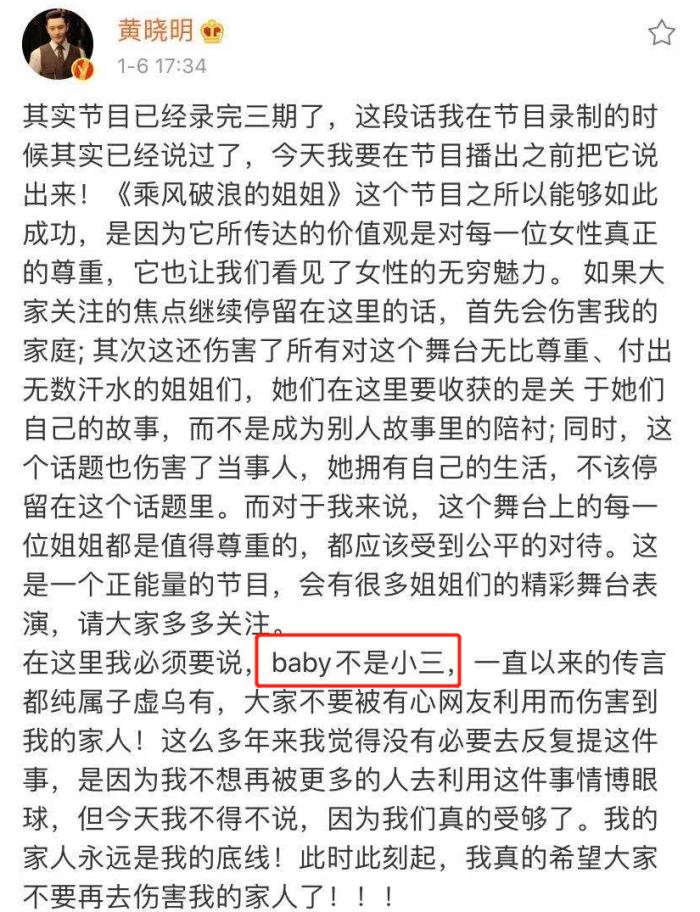 这些年关于“小三”、“插足”等感情纠纷,一直围绕在黄晓明和baby身上,两人在文中都辟谣了“小三”传闻,还了baby一个清白。