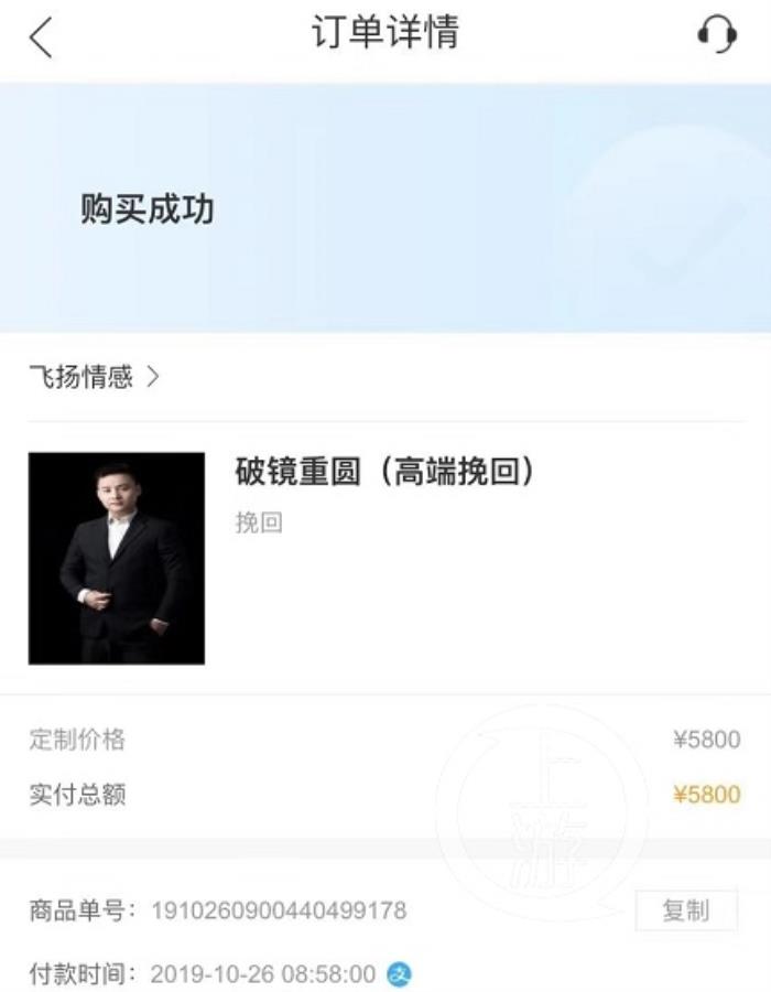 通过与“导师”初步交流后,2019年10月26日,刘茵花费5800元在“小鹿情感”平台购买了“破镜重圆(高端挽回)”服务,服务周期30天。