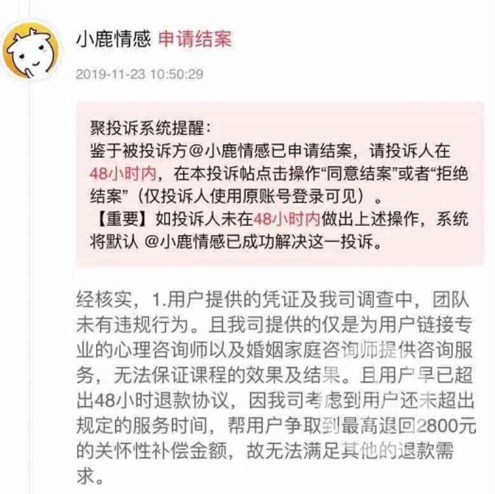 刘茵当天收到小鹿情感平台答复:经核实,用户提供的凭证及我司调查中,团队未有违规行为。另外,用户退款请求早已超过协议规定的48小时,因我司考虑到用户还未超过规定的服务时间,帮用户争取到最高退回2800元的关怀性补偿金额。无法满足其他的退款请求。