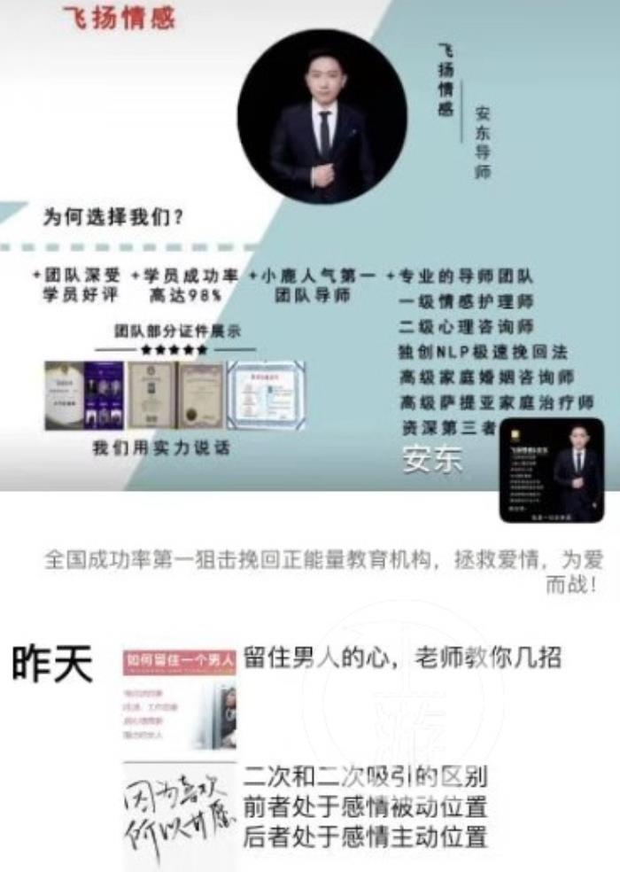 和安东类似,该名导师拥有多个头衔,包括“二级心理咨询师”、“一级婚姻咨询师”、“情感挽回专家”、“心理疏导教练”,自称擅长分手急速挽回。从事心理咨询行业6年。