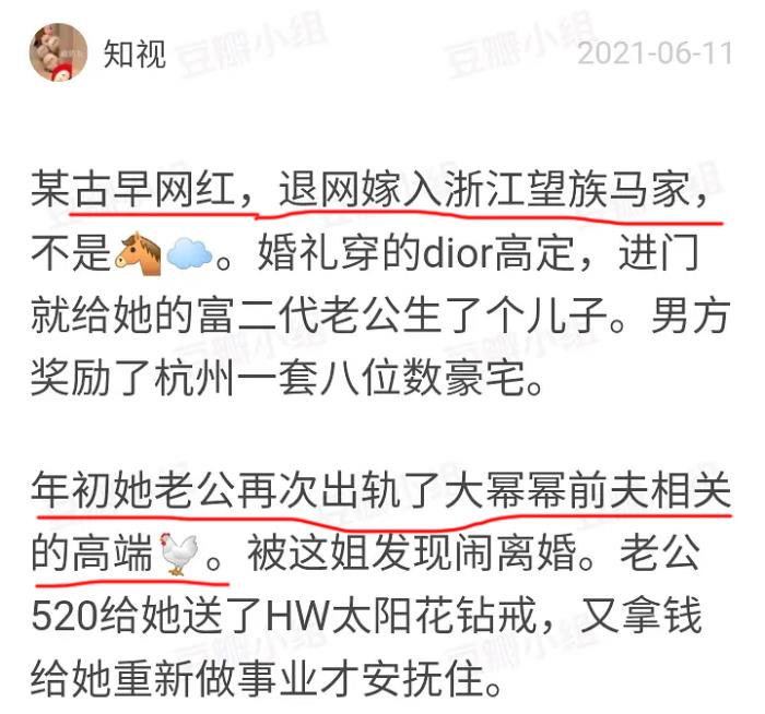 该博主发文爆料,表示一位古早女网红在隐退之后嫁入了浙江望族马家(不是马云),婚礼非常豪华,之后为夫家生下一个儿子,而作为奖励,富豪老公奖励了她一套价值八位数的豪宅。然而在今年年初,她发现老公出轨了,之后夫妻双方发生矛盾,她要闹离婚,之后老公给她送钱又送礼,才把她安抚住。