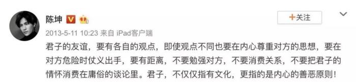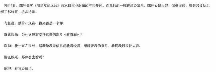 当时赵薇导演的《致青春》上映,陈坤接受访问时还特意表示说“自己和赵薇的友谊其实没有大家想象的那么铁,但是也没有大矛盾。”究其原因是陈坤觉得《致青春》的宣传捆绑了他们的友情,有借他炒作之嫌,他当时还曾发文“感谢那些利用自己的人。”