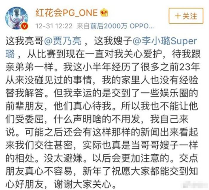 2017年12月31日,有媒体曝光已婚女星李小璐与PG One两人约饭后一同返回PG One家中并彻夜未出,疑似婚内出轨。之后,当事人双方就当晚情况进行了澄清,表明二人只是单纯的姐弟关系。PG One也火速发声,称贾乃亮和李小璐为“哥哥嫂子”。