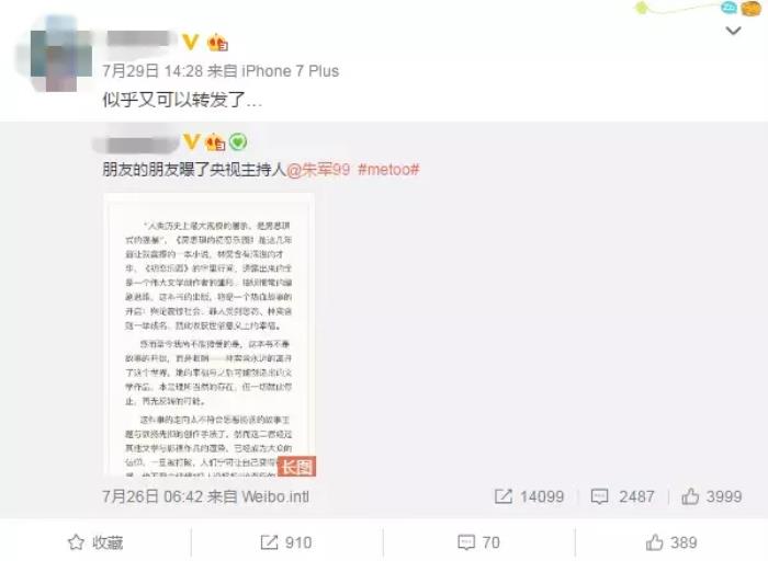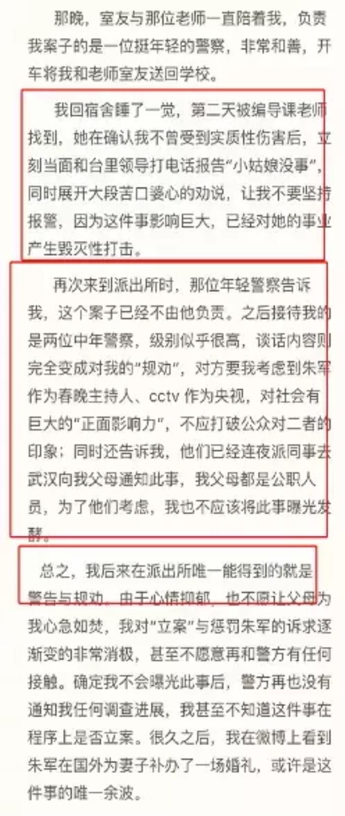 这位姑娘也在微博贴出了事情的全部始末过程,大意如下:这位小姐姐在大三的时候进入央视实习,但是却被朱军老师性骚扰。