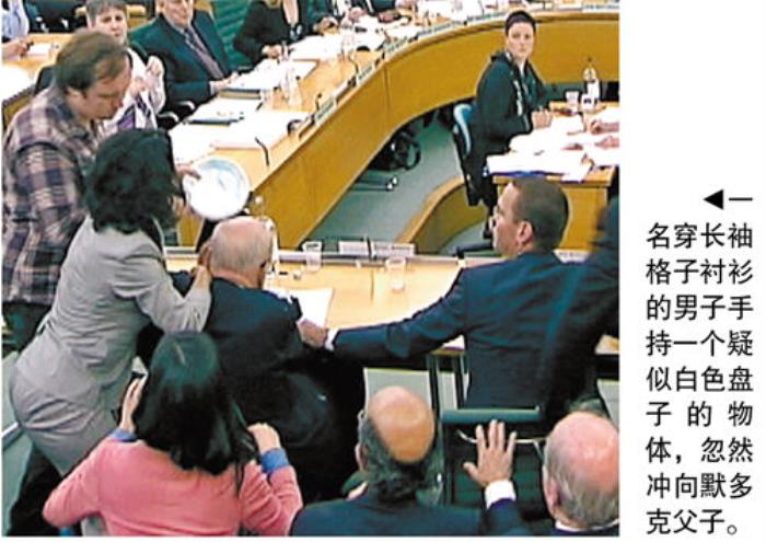 一名身穿格子花纹衬衫、坐在旁听席最后排的男子突然站起来,快步走到证人席旁,手里拿着一个盛满剃须泡沫的纸盘子向默多克砸去。从天空电视台的视频画面看,现场有一名女性惊恐地叫了起来:“不,不,不!”
