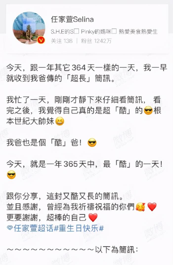 昨天晚上,Selina任家萱在微博分享出爸爸写给他的千字简讯。