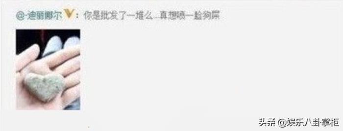 也许是感觉到这个石头不再神圣,迪丽娜尔在图片中配文质问道:“你是批发了一堆么……真想喷一脸狗屎”。