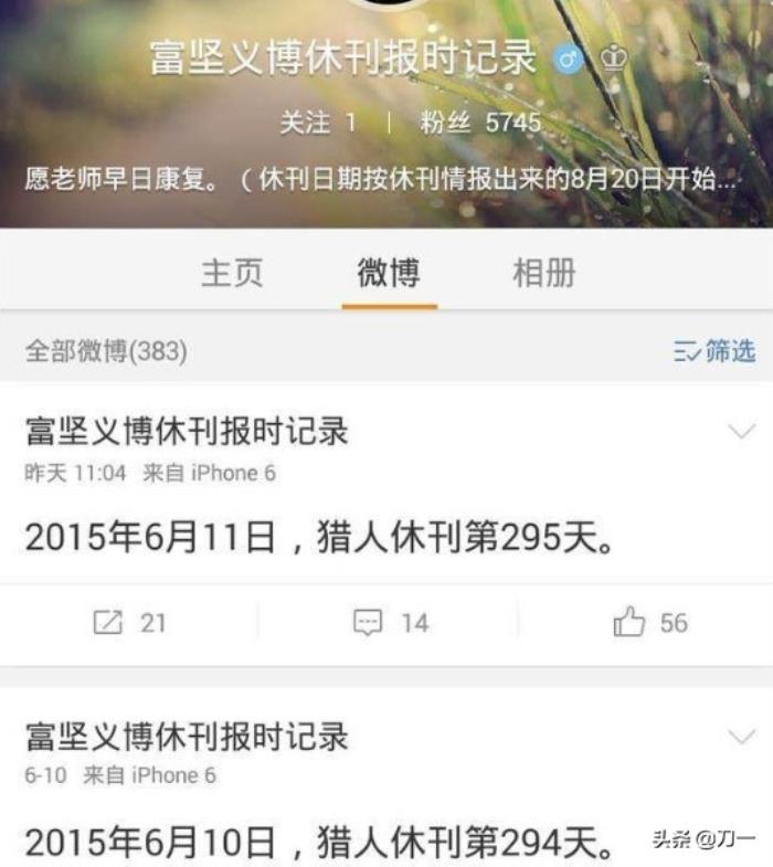 虽然粉丝们对富坚义博的“恶行”感到不满,但没有办法,《全职猎人》又不得不看,于是他们只有通过不断地玩梗来释放自己心中的不满。“富奸老贼”这个绰号便是在这个时候不胫而走。甚至还有好事的粉丝专门为富坚义博的拖更创建了一个微博,用于记录富坚老师的拖更“恶行”。