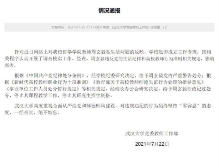 随着事件的发酵,以及周玄毅对教师这个职业带来的恶劣影响,武汉大学在7月22日下午5点左右对此事作出回应,并且对周玄毅做出相应处罚。