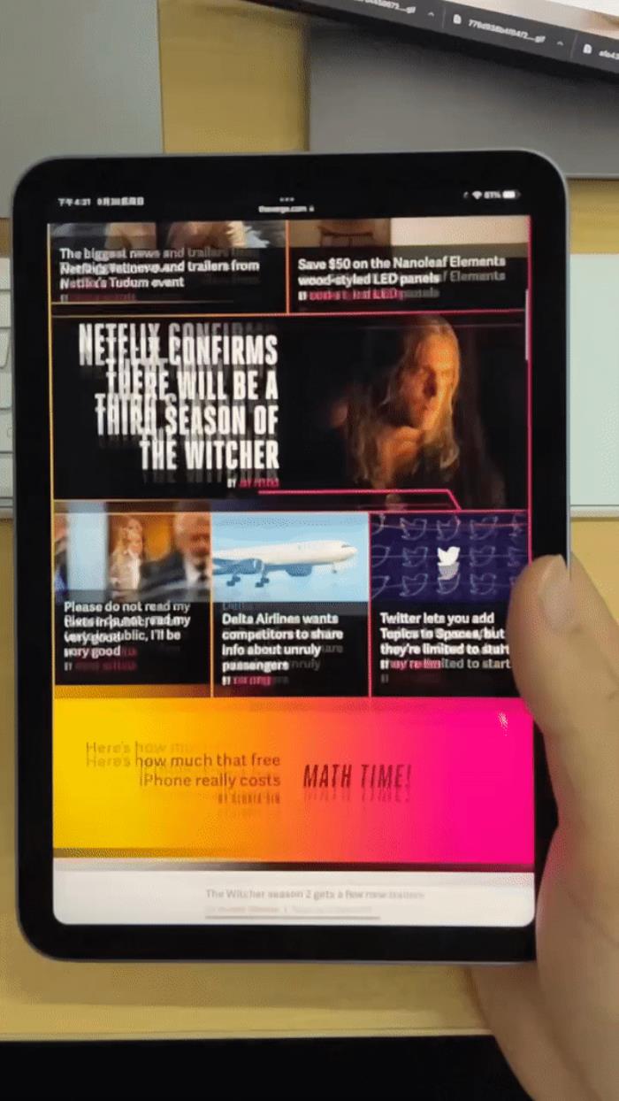 这块屏幕另外一个槽点就是果冻屏了,经过测试我们手中这台 iPad mini 6 也有这样的问题,在竖屏状态下滑动屏幕,因为左右画面刷新率不一致从而产生画面撕裂的问题。这个问题对于强迫症患者或者是喜欢使用平板阅读的用户而言是致命的,对于体验产生了非常大的影响,而苹果的回应多少有些令人心寒,但据说直营店购买的产品可以申请退货,我们并没有尝试。
