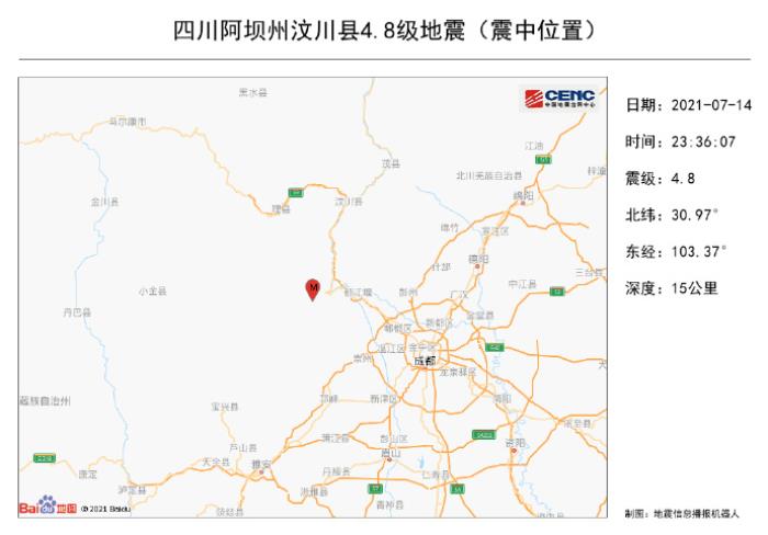 7月14日晚,汶川发生4.8级地震。地震造成都江堰震感强烈,成都、德阳、乐山等地震感明显。 震中20公里内的乡镇有三江镇、漩口镇、耿达镇、映秀镇和卧龙镇。震中距都江堰市26公里、距崇州市48公里、距成都市76公里。