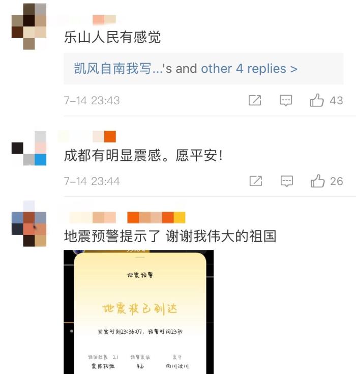 地震发生后,不少网友表示成都、德阳、乐山等地震感明显。