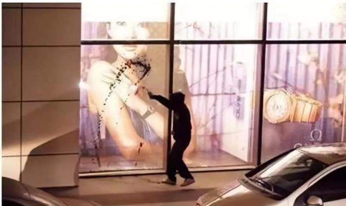 一群人穿黑衣的男人向着章子怡的巨型海报上面泼墨,随后这些人还在公寓的大厅里直接大骂章子怡抢别人老公,是小三等言论。