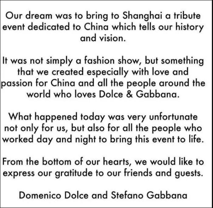 昨晚,DG在社交媒体ins上再度发表声明,宣称对中国“怀有爱与热情”,发生这一切非常不幸。