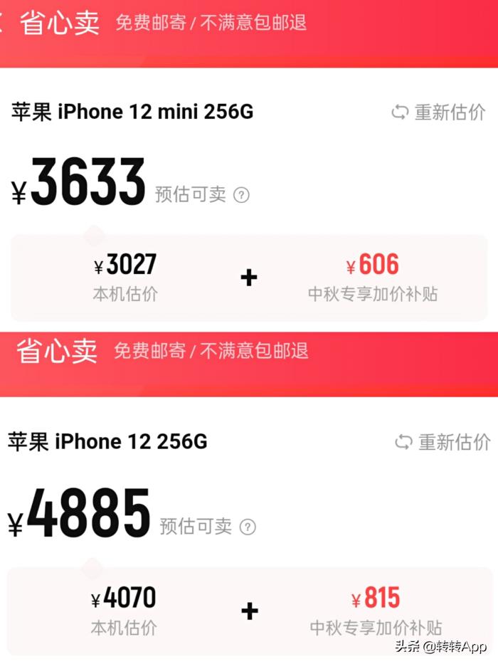 像iPhone 12在我们转转最高能收4885,而12 mini最高能收3533,基本上加个一千就能换13和13mini了,这样的换机成本大大降低,负担也没那么大。