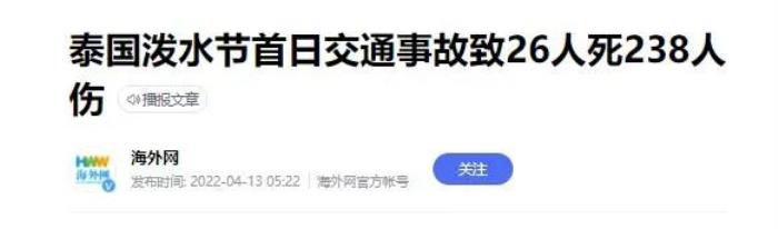泼水节首日泰国共发生237起交通事故,造成26人遇难、238人受伤。