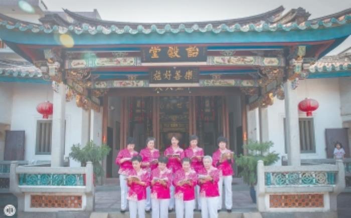 在东山县铜陵镇孙氏大厝内,蔡婉香(前排右一)和爱好歌册的姐妹们一起表演