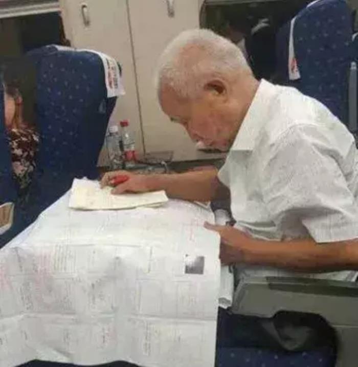在高铁二等座上,一位白发苍苍穿着破鞋的老人拿着笔纸在修改设计图纸,神情专注。