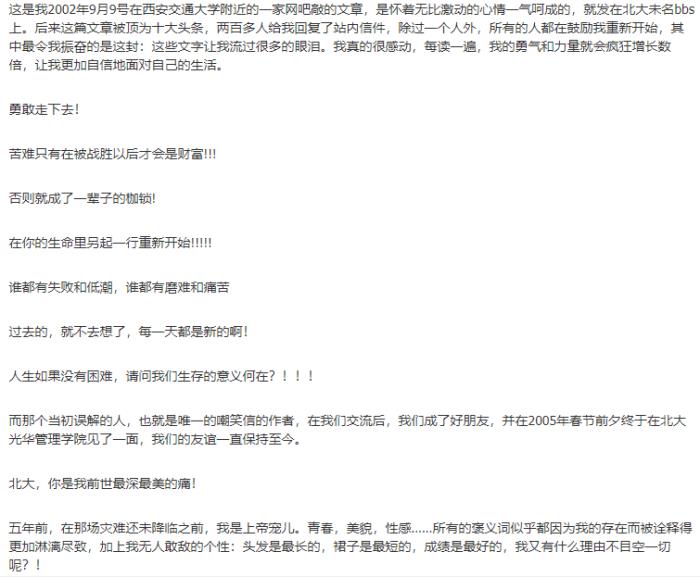 于是,在2004年,史恒侠往北大的BBS上发表了一篇她2002年写的文章——《北大,你是我前世最深最美的痛》。