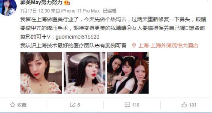 7月17日,她在社交平台发文称自己有一个新职业,留在上海从事医美行业的工作。