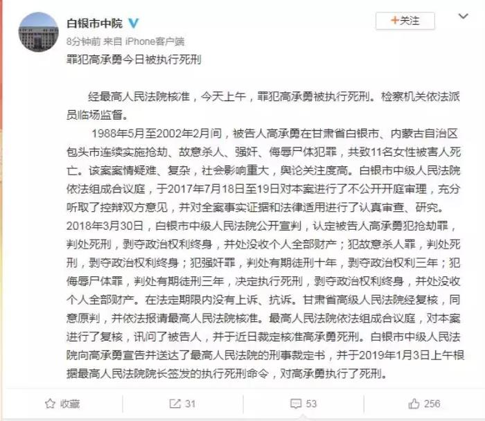 白银市中级人民法院向高承勇宣告并送达了最高人民法院的刑事裁定书,并于2019年1月3日上午根据最高人民法院院长签发的执行死刑命令,对高承勇执行了死刑。