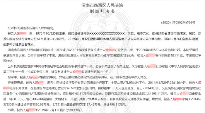 近日,中国裁判文书网公布了一则职务侵占罪一审刑事判决书。判决书显示,1975年生的姬某某,高中文化,曾是中国建设银行股份有限公司渭南分行职工,主要从事ATM机加钞工作。