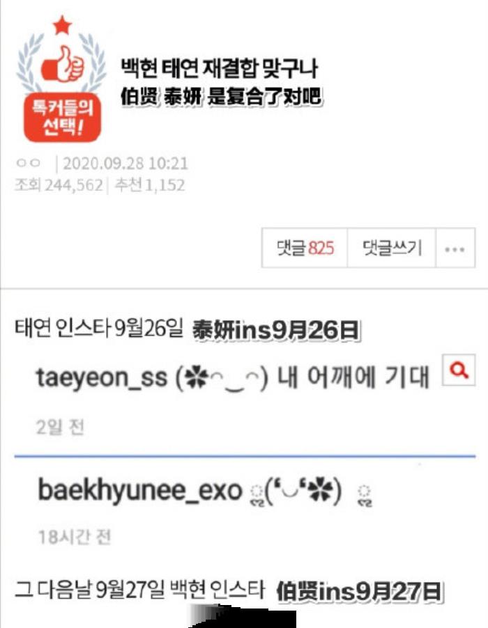娱乐圈中关于“恋情”这一话题永远都是被人们津津乐道的,谁谁恋情曝光,谁谁分手或者出轨,谁又和谁复合。模式基本相同,但网友每次都能乐此不疲地讨论,总之正主稍有点风吹草动,网友立刻就能从中捕捉到关键信息,甚至可以马上脑补出一场大戏。9月29日,有网友发现边伯贤和金泰妍在社交平台上用情侣颜文字互动,于是就开始怀疑这两人是不是复合了。