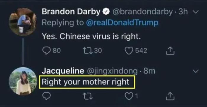 背景:川普把病毒称为“Chinese Virus”后,得到了部分美国网友的支持,有一位美国网友留言:Yes. Chinese virus is right(是的,叫“中国病毒”是对的)。