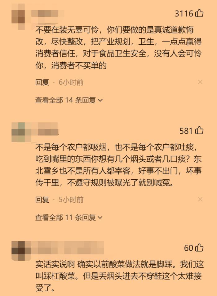 这不禁让我反问,赤脚踩酸菜的只是少数人,在酸菜池子里吸烟、吐痰的工人也是少数人,就因为这几个少数人毁了几十万亩的酸菜,毁了几万农民的经济来源,让几千名工人失去工作就真的值得吗?我们如此“网爆酸菜”就真的是对的吗?是的!是对的,更是值得的!