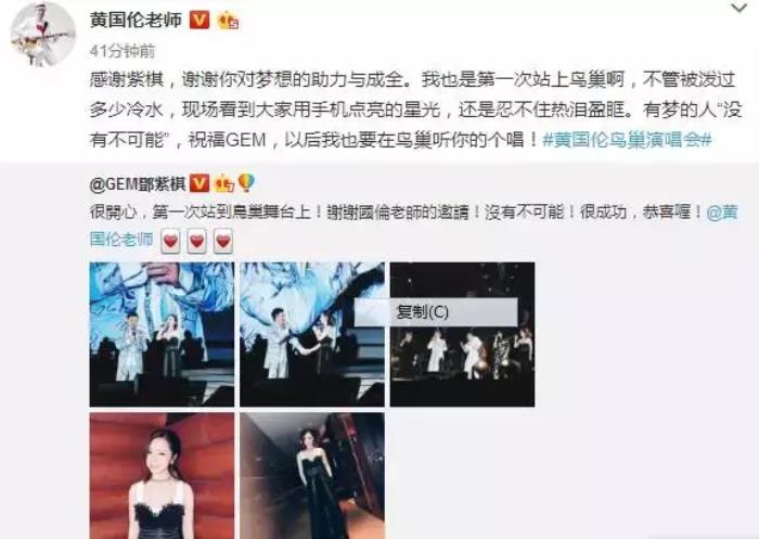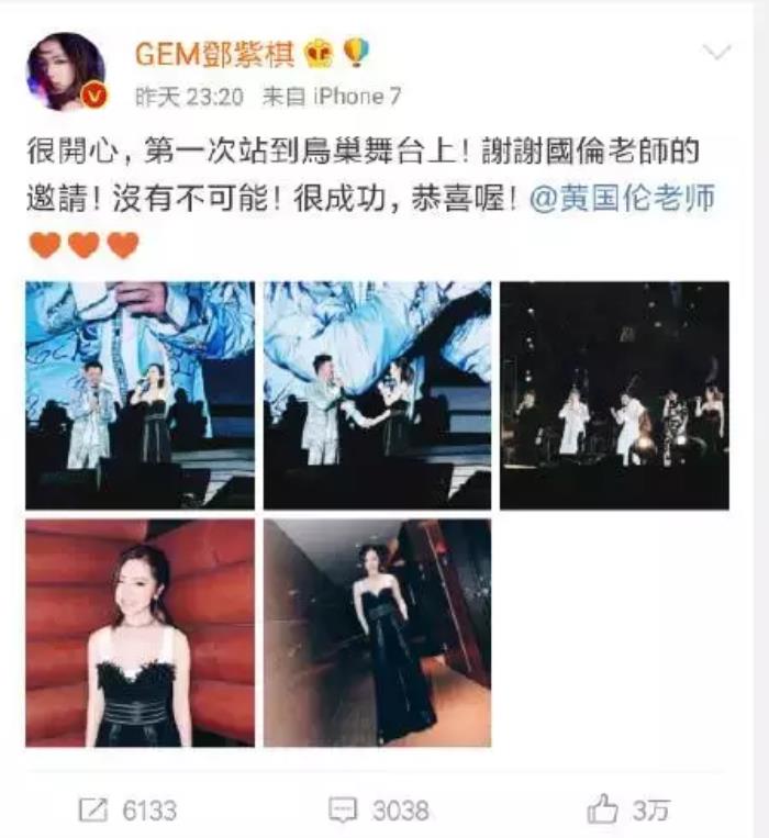 事后,邓紫棋也发博表示感谢,很开心,也是第一次站到鸟巢的舞台上,不少网友纷纷表示邓紫棋也能在鸟巢举办一场演唱会就圆满了