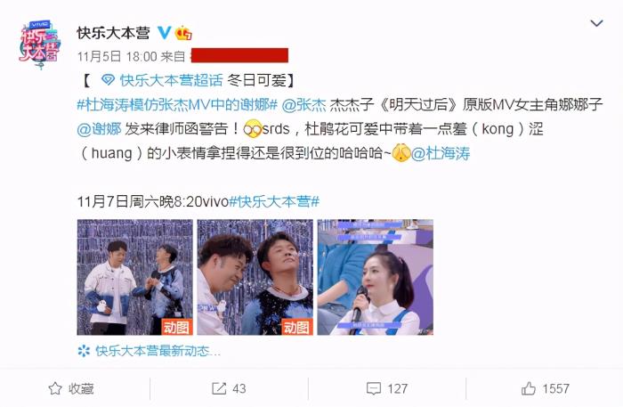 而在11月5日,《快乐大本营》发布的节目预告中,杜海涛还在节目中猛cue张杰和谢娜,虽然张杰没有现身,但是两人还是在节目中大撒狗粮,狂秀恩爱。