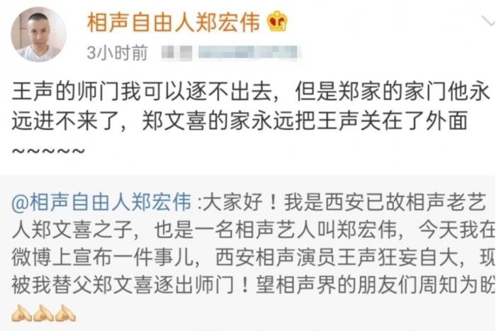 而郑宏伟的父亲郑文喜,刚好是王声的师父,于是郑宏伟便发了一条微博,称要替父亲清理门户。