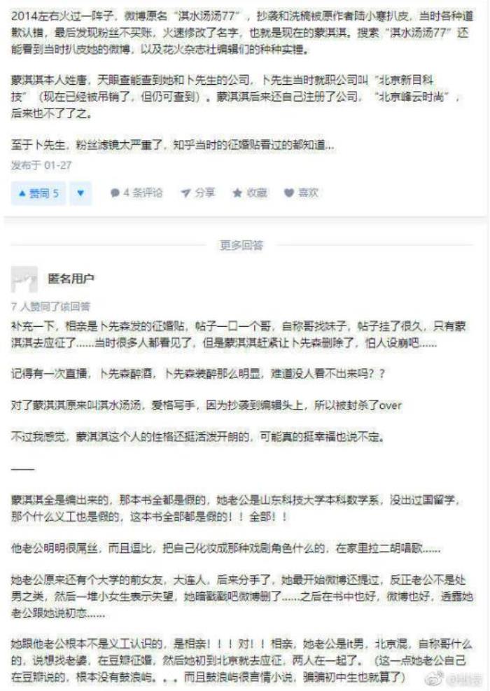 文章中卜先森身高1米8+,各种能力强,懂多国语言,曾留过学,做过义工等。 但据网友透露,二人是相亲认识的,他老公没留过学,也没做过义工,山东科技大学本科数学系毕业,二人的名下都开过公司。 具体参照下图: