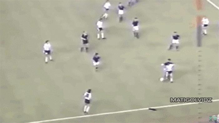 这张图片所展示的是1990年世界杯半决赛,阿根廷与东道主意大利比赛当中的一个场景。注意,那是世界杯半决赛加时赛的第109分钟,面对意大利人钢筋混凝土一般的防守,马拉多纳右路拿球后,毅然决然地选择了带球突破,没有一丝拖泥带水,没有一丝犹豫,直接杀入禁区的球王不但突破了6名意大利人的防守,还轻松将球传给了禁区弧顶处的队友。这就是马拉多纳的存在感和威慑力,这就是球王的力量。