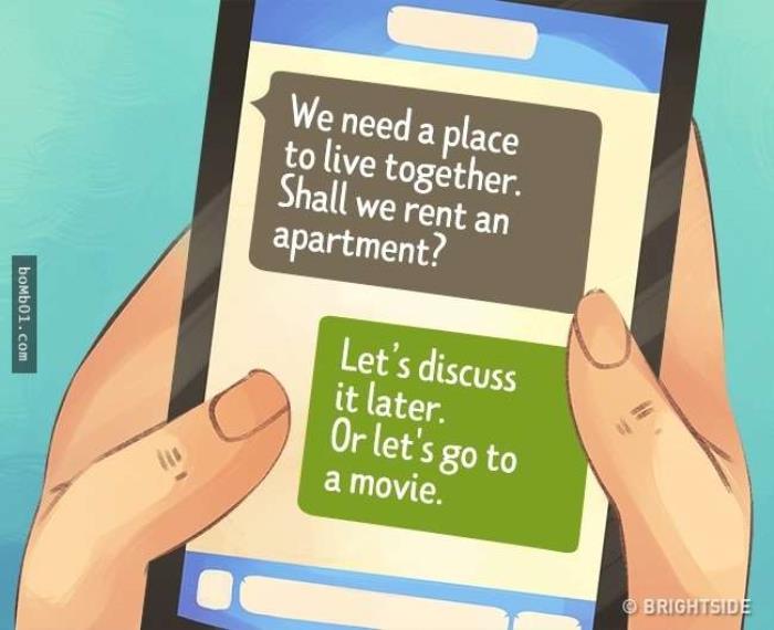 「我们需要租一间公寓来一起住吗?」「迟点再讨论吧。不如我们去看场电影。」
