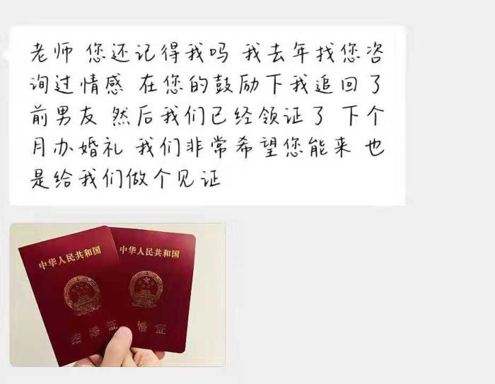 据说,他们当时已经分手半年多了,各自的事业和学业都在蒸蒸日上,但女孩心中始终有一个遗憾,就是他不在我身边,于是女孩找到我,跟我说了很多他们的过往和他们的现状,了解情况后,我建议她勇敢迈出这一步,把男生追回来。