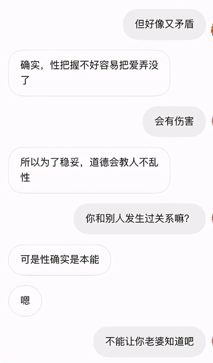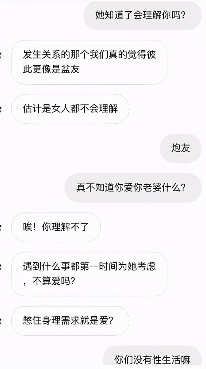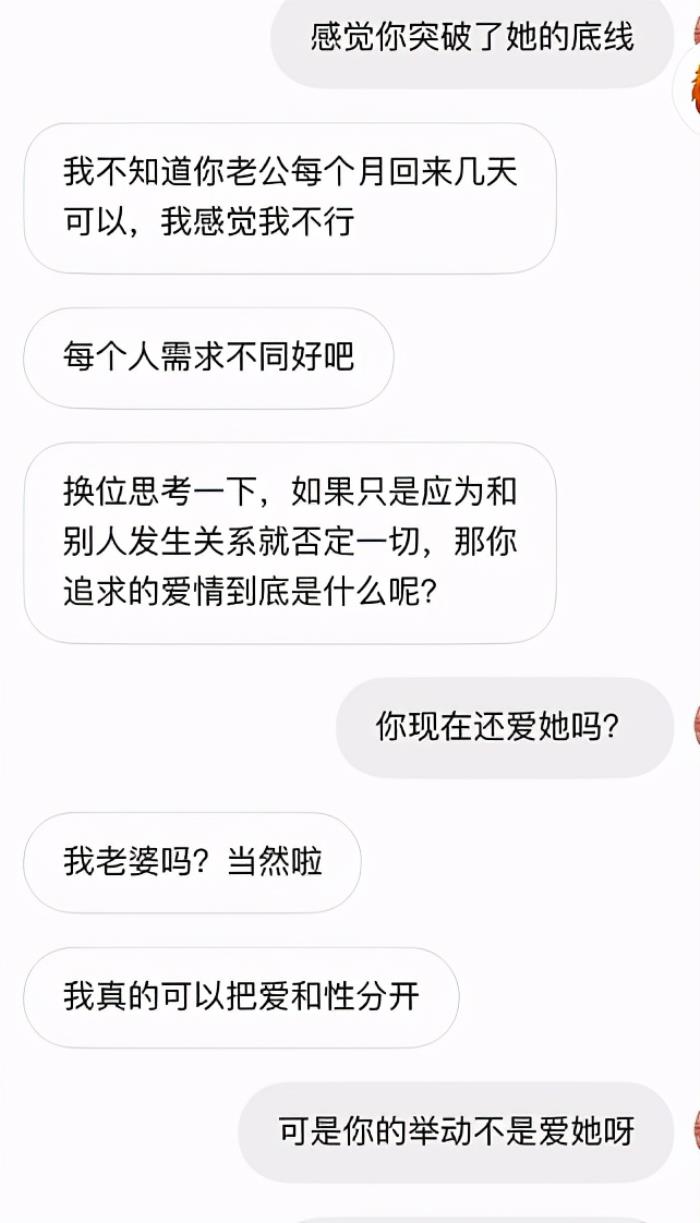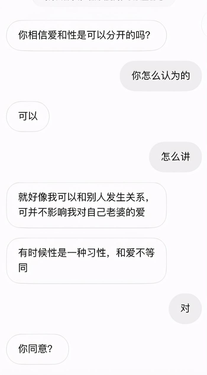 最近我发现他一直在骗我,还在和人聊天,还聊到了性,说“他认为性和爱是可以分开的,他可以做到”他去年就别人发生了关系,还说“发生关系的那个我们真的觉得彼此更像是盆友”具体看聊天记录。