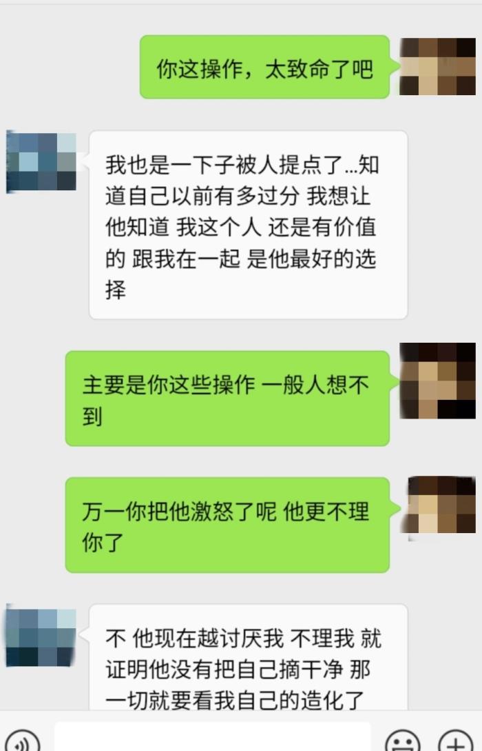 她开始重新在战术上,战略上,都重新梳理,跟我逼逼叨叨了两个半小时,她的挽回计划。思路清晰,问题的认识也精准。