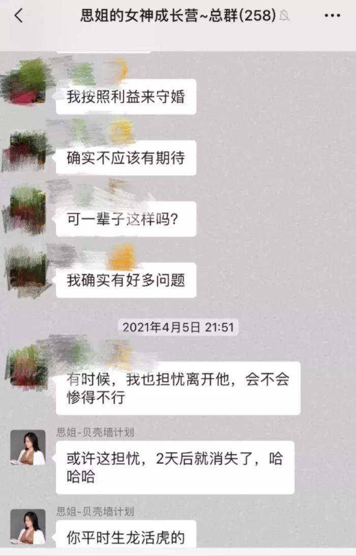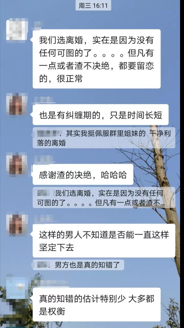 群内的姐妹们也曾经历过出轨,在出轨这段危机中,有的选择婚内守利益,跟男人选择和睦共处,同时自己发展事业,在经济上首先去达成一个独立的人。