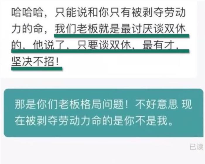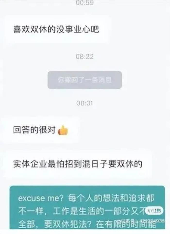 HR的说法引起了该应聘者的不满,其认为每个人的想法和追求不同,工作只是生活的一部分而不是全部。在聊天过程中,该HR还表示,老板说过最讨厌谈双休的,只要谈双休,再有才也坚决不招,最怕混日子要双休的。招聘者随之回复称是其老板的格局问题。