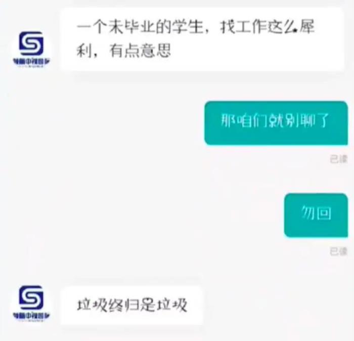 近日,湖南一名大学生在社交媒体发文称,通过BOSS直聘平台与湖南领航中视国际公司HR沟通时,被后者称“垃圾终归是垃圾”。