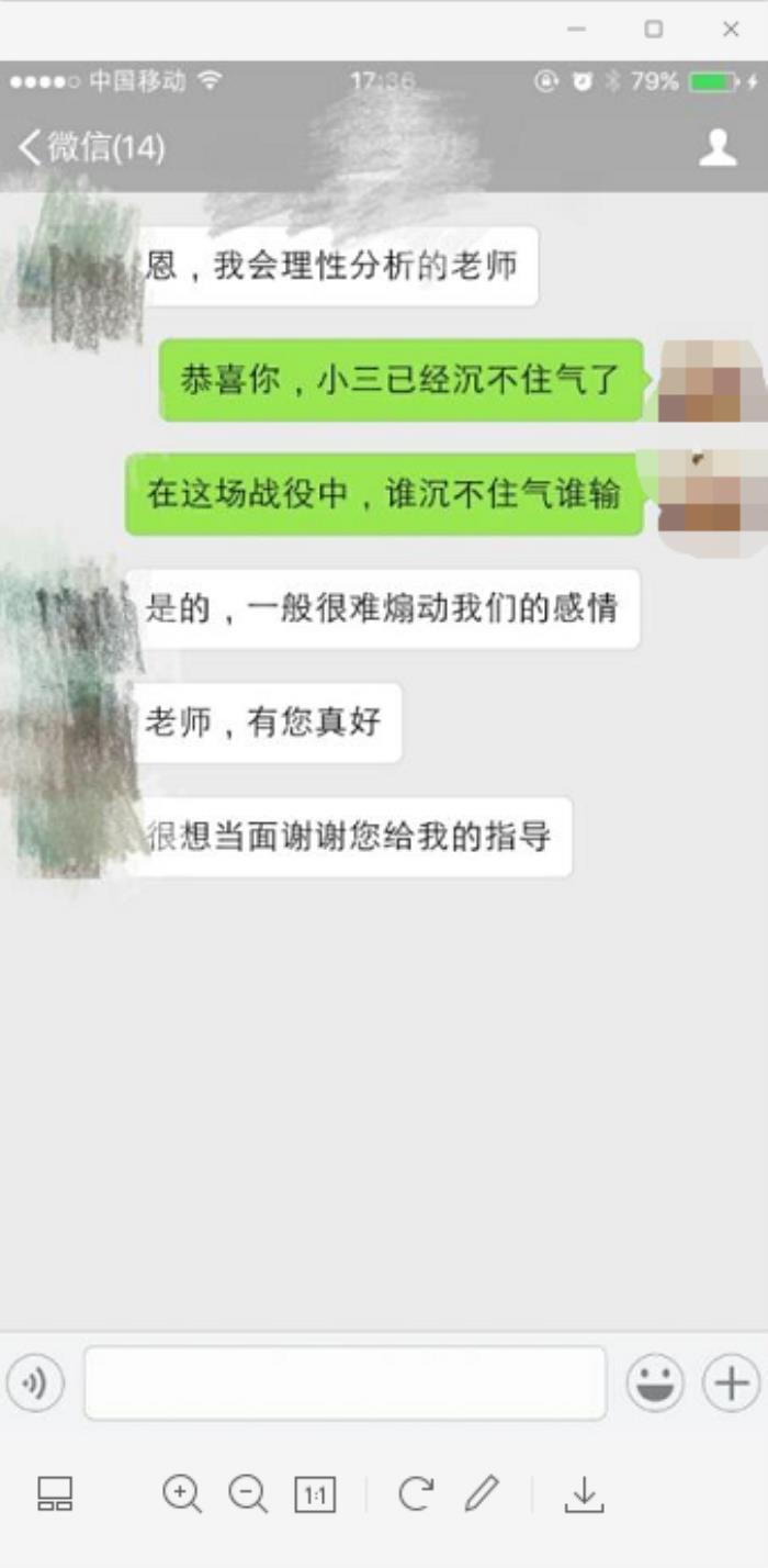 老师给我电话咨询,我按晓艾老师的布局,认真做了一个星期天,局同情况发生了逆转。老公居然和第三者提出分手了,他说:”我不愿意和老婆离婚“。一开始我都觉得在做梦。直到,有一天第三者上家里面来和我闹,我才敢相信原来这一切都是真的。