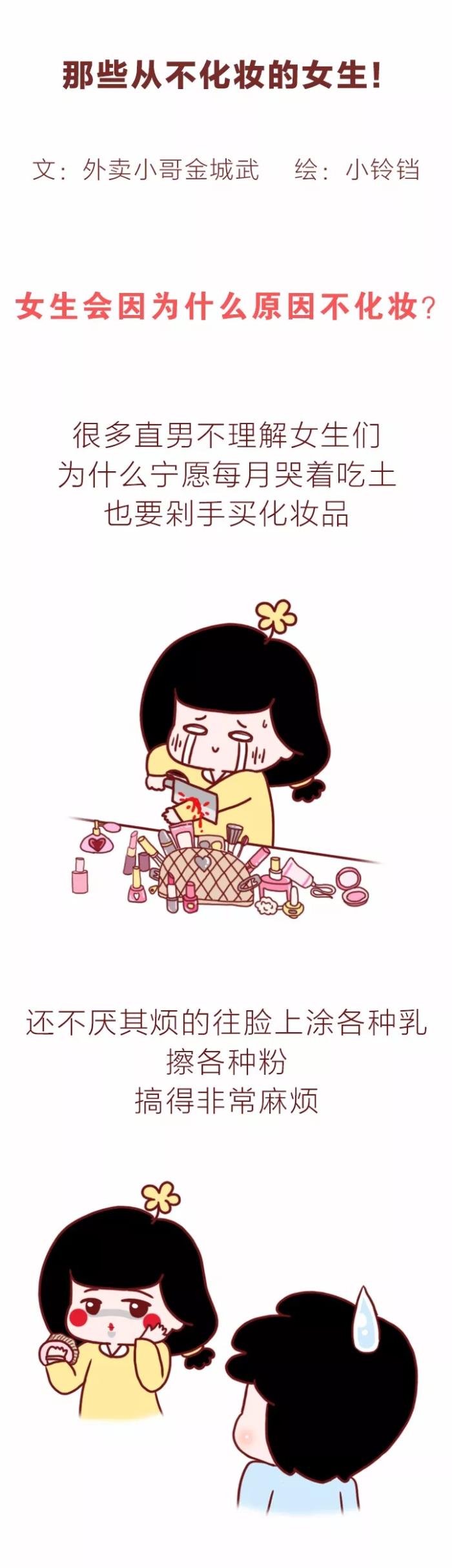 其实一般工作没有要求的话,女生是不爱化妆的,因为化妆品很贵,而且很费时。如果有一天,你去约一个女孩子吃饭,发现她化妆了,说明她很重视这次的约会噢~男生们也要好好把握,特别时不要随意放女生鸽子。因为为了和你约会,这一套下来也不少呢!