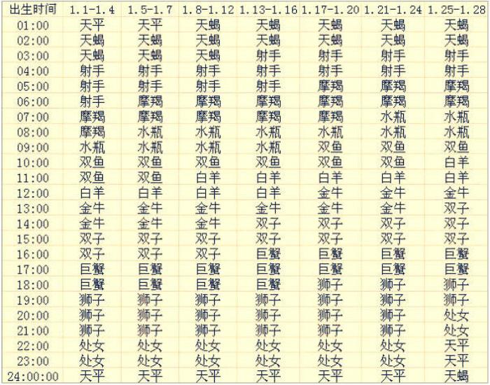 一月出生的12星座上升星座查询表